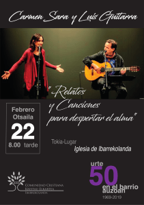 El próximo 22 de Febrero, a las 20’00, en la Iglesia de Ibarrekolanda vienen a celebrarlo con nosotras y nosotros con sus cuentos y canciones CARMEN SARA y LUIS GUITARRA.